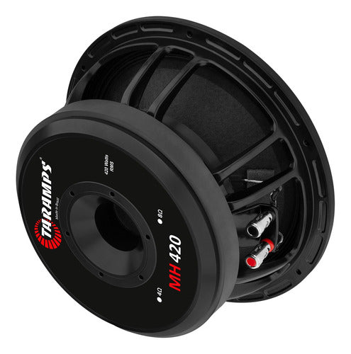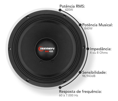 O alto-falante MH 420 tem 10 polegadas e suporta até 840 Watts em potência de programa musical a 4 ohms. Seus timbres definidos, limpos e naturais chamam atenção desde os médios graves até os médios agudos. É compatível com qualquer tipo de sistema de som, seja ele de som automotivo ou profissional! O mundo sonoro do Grupo Taramps está cada vez mais perto de você.
