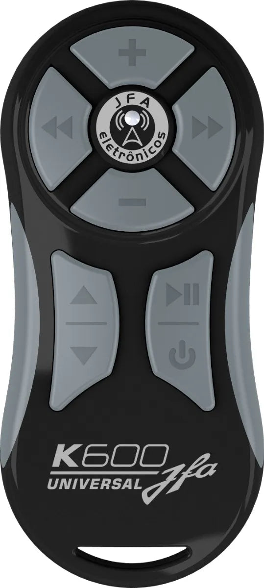 Controle Longa Distância JFA K600 600 Metros Preto Com Tecla Cinza Marca JFA Modelo K600 Preto Com Tecla Cinza Informações do Produto Alcance de 600 metros em área aberta visada; Agilidade com 8 teclas em silicone que comandam as principais funções dos aparelhos; Design e ergonomia com 10 combinações de cores; Memória com mais de 220 modelos de aparelhos para áudio e vídeo TRANSMISSOR 8 funções definidas; Teclado em silicone na cor Cinza com gravação em baixo relevo; Chassis em plástico ABS Preto, Frequência de operação 433,92 MHz Alimentação 12V bateria modelo A23 Cor do led da Central vermelho Cor do led do Controle azul RECEPTOR Modo memória (contém em sua memória os principais players do mercado); Chassis em plástico ABS preto; Frequência de operação 433,92 MHz; Alimentação 9 a 16Vdc;