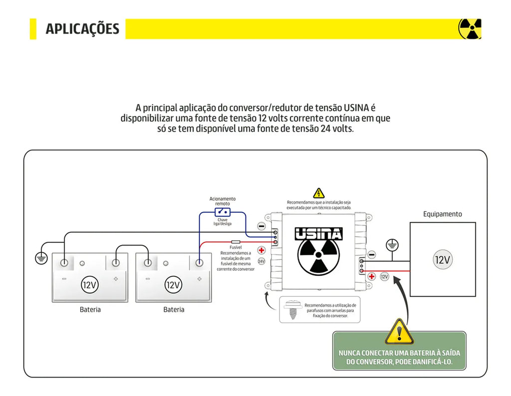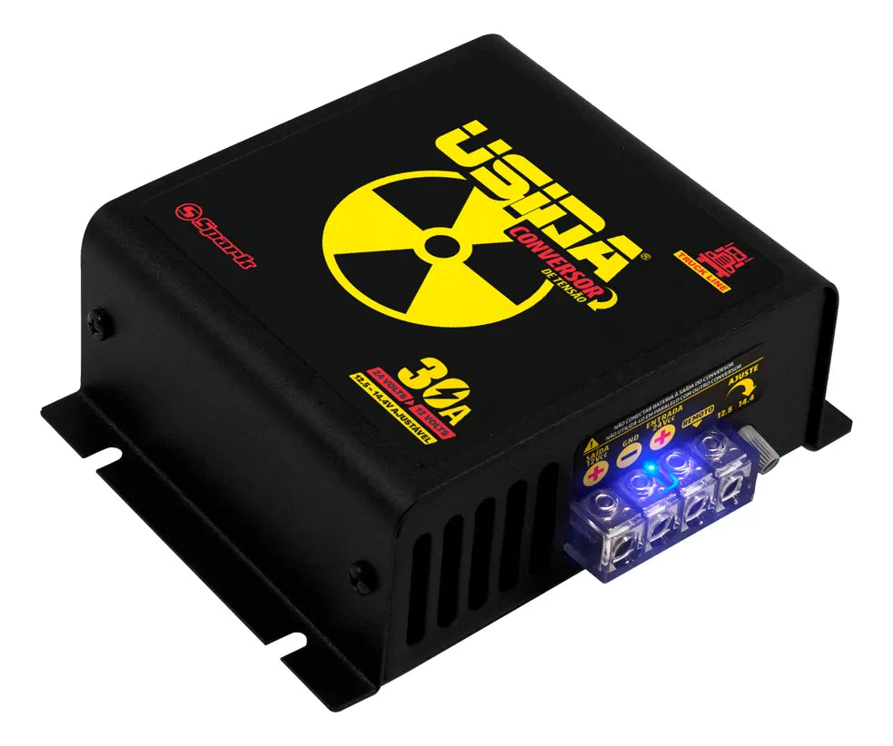 Conversor Redutor de Tensão 24v Volts para 12v Amperes Half Bridge Buck Converter Síncrono Som Caminhão Truck Bateria + Brinde Conversor USINA projetado para entregar o melhor desempenho possível efetuando a redução de tensão de sistemas 24 volts para alimentar equipamentos 12 volts. Ele utiliza em seu circuito a topologia Half-Bridge Buck converter Síncrono em que se utiliza transístores MOSFETS de baixa perda com resistência interna de 2miliohms, isso garante baixa queda de tensão nos transístores traduzido em um alto rendimento na ordem de 95%, o que se traduz em um produto leve e pequeno, porém, potente e robusto. ============ OBSERVAÇÃO: ============ ** Não conectar uma bateria na saída do conversor, risco de danificá- lo ** ======================== ESPECIFICAÇÕES TÉCNICAS: ======================== Tensão de operação 21 a 32Vcc Corrente de entrada (Máx.) 19A@21V Tensão de saída 12,5@14,4Vcc / +-1% Corrente de saída nominal 30A @ 12,5V Ripple de saída 500mVp-p Frequência de chaveamento 24Khz Potência de saída (Max. Contínua) 375W Rendimento típico 92% Cabo de entrada (Recomendado) 6mm² Cabo de saída (Recomendado) 10mm² Fusível entrada (Recomendado) 25A Peso 0,395Kg Dimensões(CxLxA) 124x139x53mm ======================== CONTEÚDO DA EMBALAGEM: ======================== 01 Conversor Usina 24V 12V 30A 01 Adesivo Usina 01 Chaveiro (Brinde) 01 Manual Do Usuário
