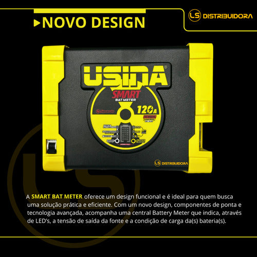 A nova linha de fontes Smart Bat Meter oferece 3 modos de operação (Fonte Automotiva, Carregador e Tensão Fixa), tornando a aplicação mais prática em sistemas de som automotivo, recarga de baterias e alimentação de equipamentos 12v. Seu design sofisticado confere à fonte uma aparência exclusiva, única da Usina. O novo display traz funcionalidades aprimoradas e, por meio de LEDs, indica a tensão de saída e a condição de carga de baterias, proporcionando maior controle e eficiência.