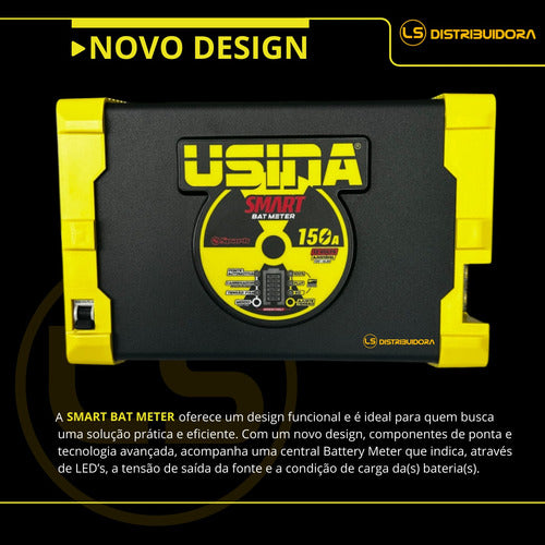 A nova linha de fontes Smart Bat Meter oferece 3 modos de operação (Fonte Automotiva, Carregador e Tensão Fixa), tornando a aplicação mais prática em sistemas de som automotivo, recarga de baterias e alimentação de equipamentos 12v. Seu design sofisticado confere à fonte uma aparência exclusiva, única da Usina. O novo display traz funcionalidades aprimoradas e, por meio de LEDs, indica a tensão de saída e a condição de carga de baterias, proporcionando maior controle e eficiência.