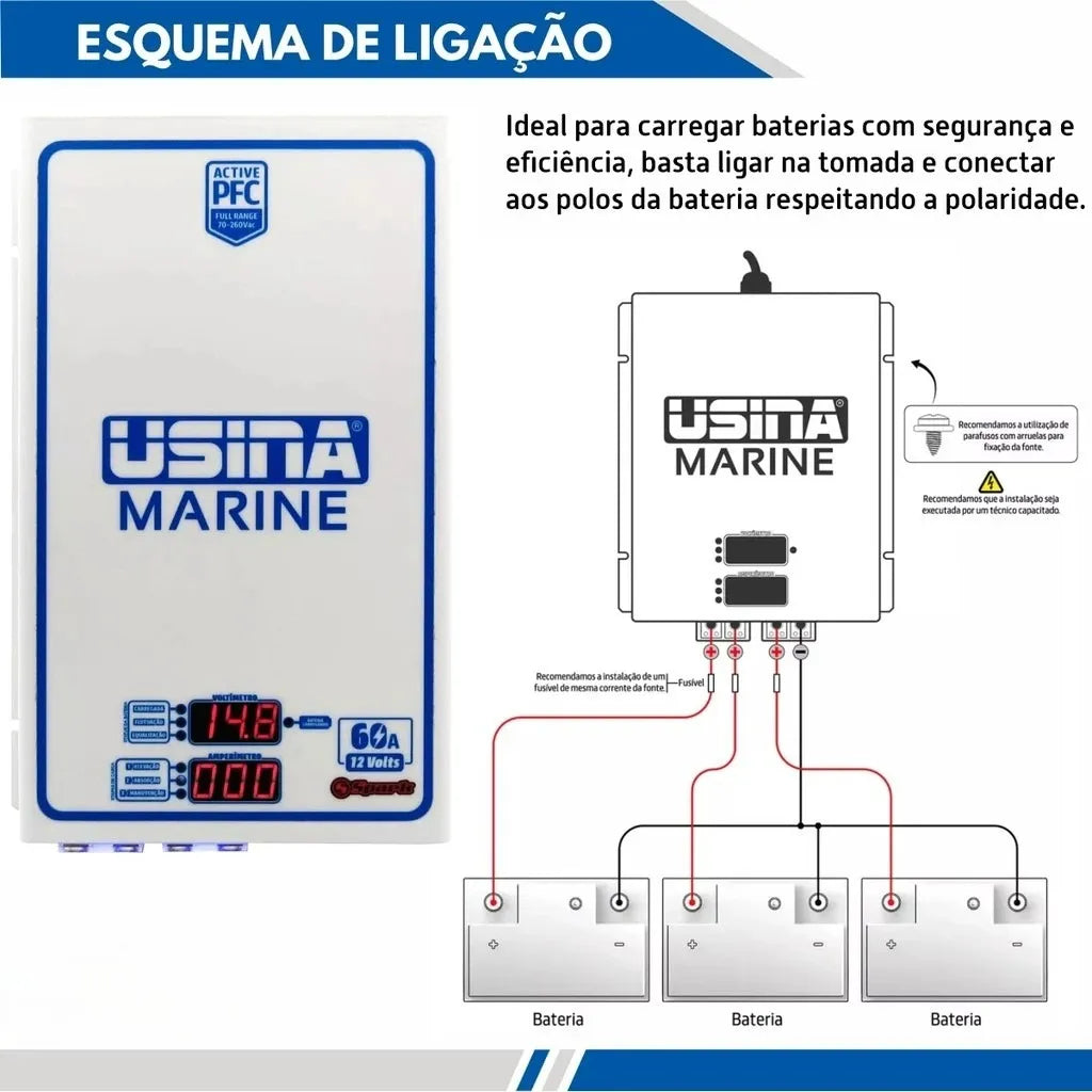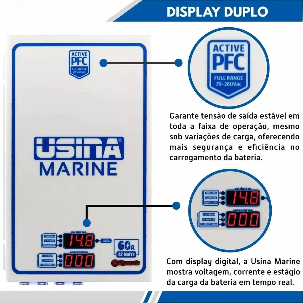 Carregador de Baterias Náutico Usina Marine – 60A | Alta Performance e PFC Ativo