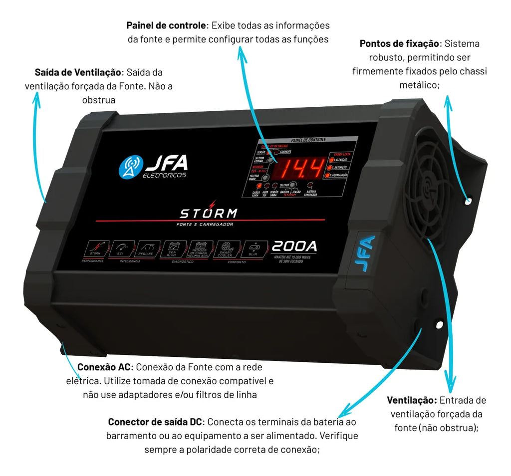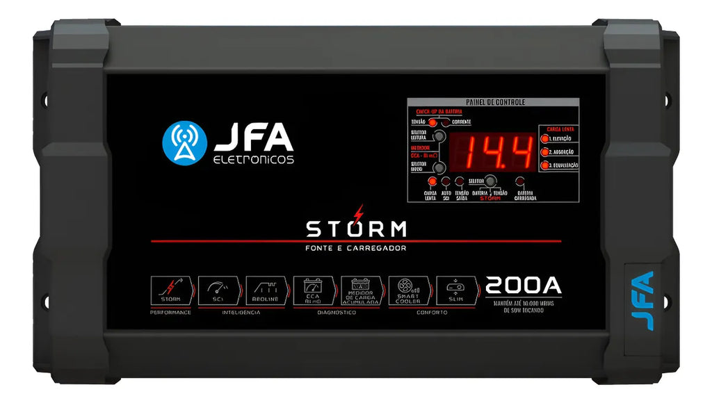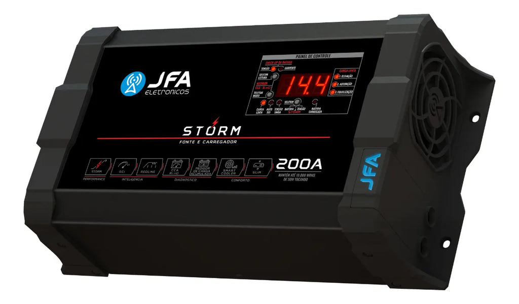 FONTE JFA STORM 200A MONOVOLT - CARREGADOR AUTOMOTIVO - Monovolt: 220V A Fonte e Carregador Storm é mais que uma fonte. Ela é a revolução de tudo o que a JFA já produziu. Equipada com a mais alta tecnologia, compacta e com funções exclusivas, a Fonte Storm é a melhor escolha para carregar, alimentar e também monitorar o funcionamento de baterias automotivas. Ela reúne as principais características das linhas SCI e Redline e inaugura um novo conceito de Fonte Inteligente. Diferenciais da Fonte e Carregador Storm: - PERFORMANCE: Função Storm que eleva, por curto tempo, a tensão de saída para 15V, dando a máxima performance ao amplificador; - INTELIGÊNCIA: Sistema de Carga Inteligente (SCI) e Sistema de Carga lenta em três fases; - DIAGNÓSTICO: Exclusiva função de diagnóstico da bateria, em apenas 10 segundos, através do medidor de CCA e análise real da capacidade de acúmulo de carga; - CONFORTO Sistema de ventilação inteligente com controle dinâmico por PWM; Design compacto, menor que as linhas anteriores, e harmônico, ideal para qualquer projeto; INFORMAÇÕES TÉCNICAS: - Entrada: 170 a 240Vac (mono-volt) - Consumo com máxima carga: 3000W - Corrente máxima de saída: 200 Amperes - Tensão de saída selecionável: 12,6V / 13,0V / 13,4V / 13,8V / 14,0V / 14,4V - SCI - Sistema de Carga Inteligente: 13,8 / 14,4 cíclico - Sistema de carga lenta 3 fases - Personalizavel: Elevação / Absorção / Equalização - Smart Cooler - Sistema de ventilação inteligente: Controle dinâmico por PWM - Precisão voltímetro / amperímetro: 99% / 96% - Proteções: Excesso de carga / Curto na saída / Temperatura - Potência máxima com bateria: 10.000W rms - Potência máxima sem bateria: 2.500W rms - Dimensões (LXAXP): 317 x 172 x 95 mm - Peso: 2,650 CONTEÚDO DA EMBALAGEM: - 1 Fonte Storm 200a Monovolt JFA - Manual Digital (Via QR code na embalagem ou acessar site do fabricante) ATENÇÃO: - Garantia de 12 meses. - Recomendamos que a instalação seja feita por profissional especializado e não nos responsabilizamos pelo mau uso do produto. - Imagens meramente ilustrativas. Garantia de fábrica: 365 dias