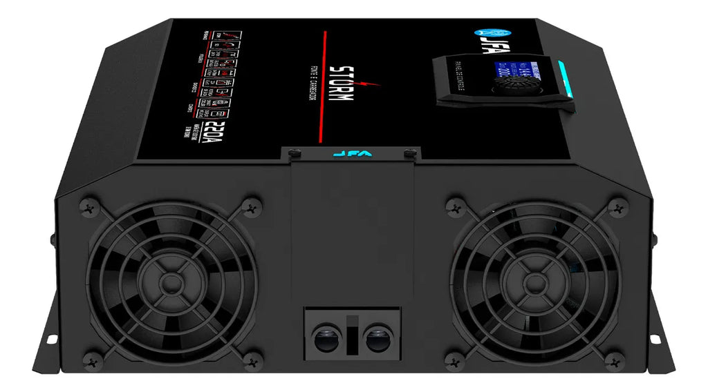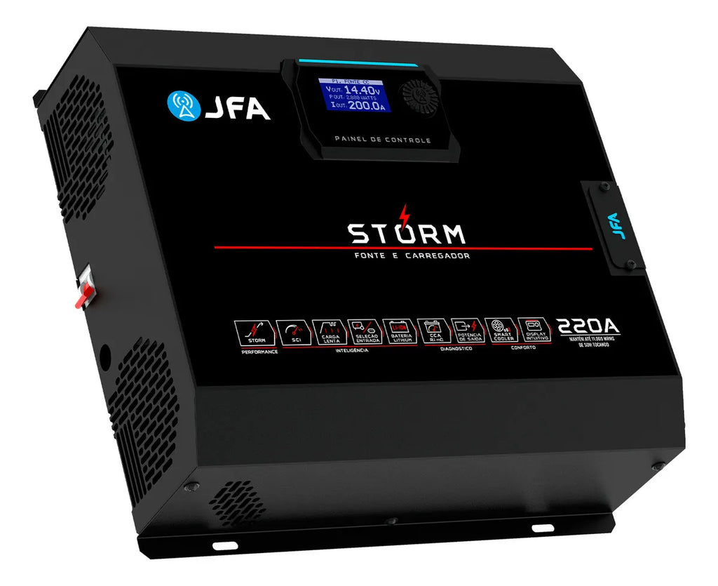 Fonte JFA Storm 220A – Inteligência, Potência e Controle em Alta Performance Com visual marcante, display moderno e fácil de operar, a Storm 220A é equipada com funções exclusivas que colocam você no comando. São 10 modos inteligentes, incluindo opções para geradores, baterias de lítio, carga lenta, equalização, teste de CCA e muito mais. E o melhor: configurar tudo isso é intuitivo. Basta girar o botão para navegar pelas funções e acompanhar cada etapa diretamente no display iluminado. Com tecnologia de ponta e construção robusta, a Storm 220A garante estabilidade energética, proteção avançada contra falhas e compatibilidade total com baterias automotivas, estacionárias e de lítio. Diferenciais da Fonte e Carregador Storm 220A: - Display gráfico completo e interativo, que facilita o acompanhamento em tempo real de todas as funções e parâmetros da fonte - 10 modos inteligentes de operação, incluindo SCI, carga lenta, lithium, teste de CCA e outras opções que se adaptam a diferentes tipos de bateria e situações de uso - Compatível com baterias de lítio e geradores, ampliando as possibilidades de aplicação em sistemas modernos e exigentes - Tensão de saída ajustável entre 12,5V e 14,5V, para personalizar o carregamento conforme a necessidade do sistema - Função STORM, que eleva a tensão para até 15V por 30 segundos, extraindo o máximo desempenho dos seus amplificadores nos momentos mais exigentes - Sistema de Carga Inteligente (SCI), que analisa automaticamente o estado da bateria e adapta o carregamento para maior eficiência e segurança - Carga lenta em três fases, garantindo recarga profunda e protegendo a vida útil da bateria - Sistema de ventilação com controle PWM, que melhora a dissipação térmica e reduz o ruído durante o funcionamento - Proteções contra subtensão, sobretensão, sobrecorrente e sobretemperatura, assegurando operação segura em qualquer condição Características Técnicas: - Entrada AC: 90 a 140Vac / 170 a 240Vac (Bivolt automático) - Consumo com máxima carga: 3350W - Corrente máxima de saída: 220a - Medidor de tensão de entrada: Vac -TRUE RMS - Display: Display gráfico 128x64px (exibe tensão, corrente, potência e tensão Ac simultâneos) - Tensão de Saída Ajustável: 10,0Vdc a 16,0Vdc (Ajustável - steps de 0,1Vdc digital) - SCI - Sistema de Carga Inteligente: 13,BVdc -14,4Vdc cíclico - Sistema de carga lenta em 4 fases: Teste, elevação, absorção, flutuação - Sistema de Carga de equalização automática: Em 4 fases (teste, elevação, equalização, flutuação) com ajuste de duração da equalização - Sistema de carga para baterias lithium/solar: Configurável de 10,0Vdc a 16,0Vdc com ajuste de corrente máxima e tempo de carga - Sistema seleção de entrada: Selecionável - Rede AC/ Modo Gerador - Smart Cooler - Sistema de Ventilação Inteligente: Controle dinâmico por PWM - Precisão do Voltímetro/Amperímetro: 99%/96% - Proteções: Excesso de carga/Curto na saída/Temperatura - Dimensões: 110mm X 320mm X 290mm (L x A x P) - Peso kg: 4,1kg