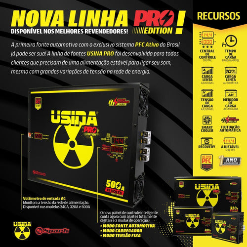 A fonte USINA PRO dispõe de recursos nunca antes utilizados em fontes automotivas. Em sua entrada, ela conta com o circuito de PFC ATIVO, que corrige o fator de potência da fonte otimizando o consumo de energia e estabilizando a tensão da rede possibilitando que a fonte sempre forneça a mesma corrente de saída independentemente da tensão de entrada. O gabinete é construído em chapa de aço com pintura eletrostática, garantindo ao conjunto segurança, resistência e durabilidade.