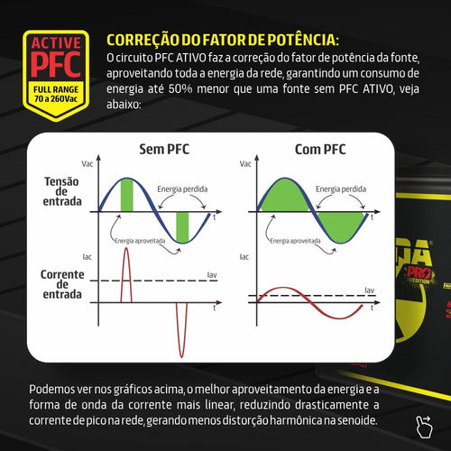 Correção do fator de potência: o circuito PFC ATIVO faz a correção do fator de potência da fonte, aproveitando toda a energia da rede, garantindo um consumo de energia até