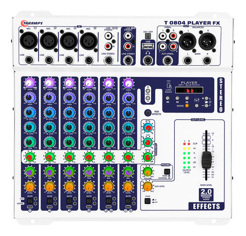 Apresentamos a Taramps T 0804 Player FX Multicolor, uma mesa de som que combina sofisticação e versatilidade, perfeita para qualquer configuração de som, seja ao vivo ou em estúdio. Com 8 canais de entrada, você conta com 4 canais dedicados para microfones (conexões XLR) e instrumentos (conexões P10), além de 4 canais Line estéreo com RCA e P10.
