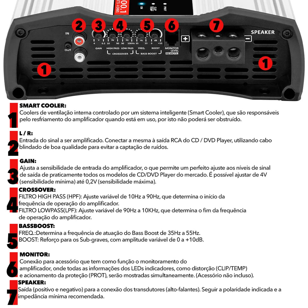 Potência de saída: 5.000W RMS @ 4 Ohms