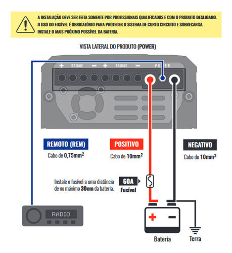 É obrigatória a instalação de um fusível entre o produto e a bateria para