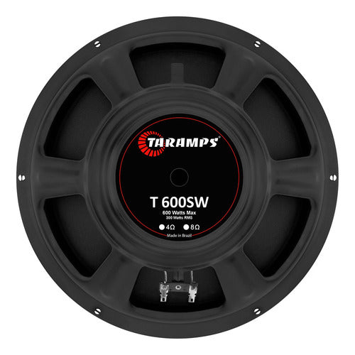 O Alto Falante Taramps T 600 SW de 12 polegadas é o subwoofer ideal para realçar os graves do seu som, proporcionando alto desempenho e muita qualidade sonora. Capaz de suportar 300 WRMS e até 600 Watts em programa musical, ele se destaca pela sua ampla resposta de frequência, que vai de 32Hz a 4000Hz. Outra característica marcante é a sua construção, que conta com conjunto magnético de duplo ferrite, cone em celulose e bordas de borracha. Está disponível nas versões de 4 ou 8 Ohms.